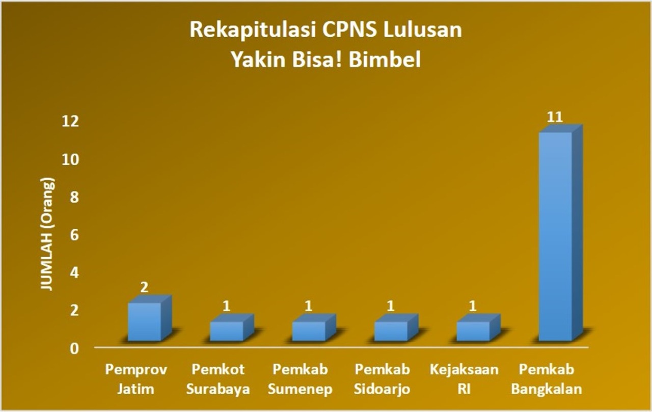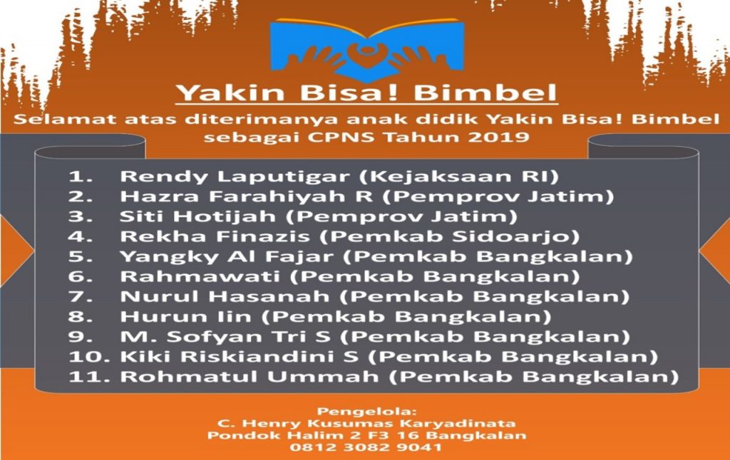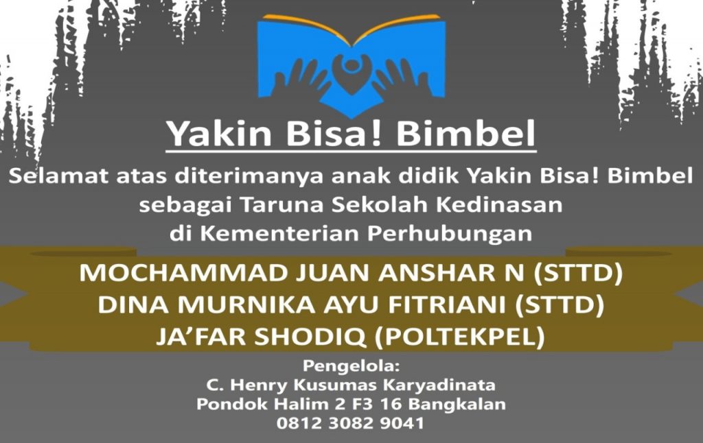 Selamat Datang di Yakin Bisa! Bimbel Media belajar bersama dan konsultasi akademik pertama di Bangkalan untuk TUMBUH dan BERKEMBANG menjadi calon taruna sekolah kedinasan atau calon pegawai negeri sipil. Program Seleksi Kompetensi Dasar Test Potensi Akademik Psikotest TOEFL Test Kesehatan Jiwa Kesamaptaan Pantukhir Wawancara Sekolah Kedinasan Gabung Sekarang Calon Pegawai Negeri Sipil Gabung Sekarang Alamat : Pondok Halim 2 F3 16, Bangkalan Kontak :+62 812-3082-9041